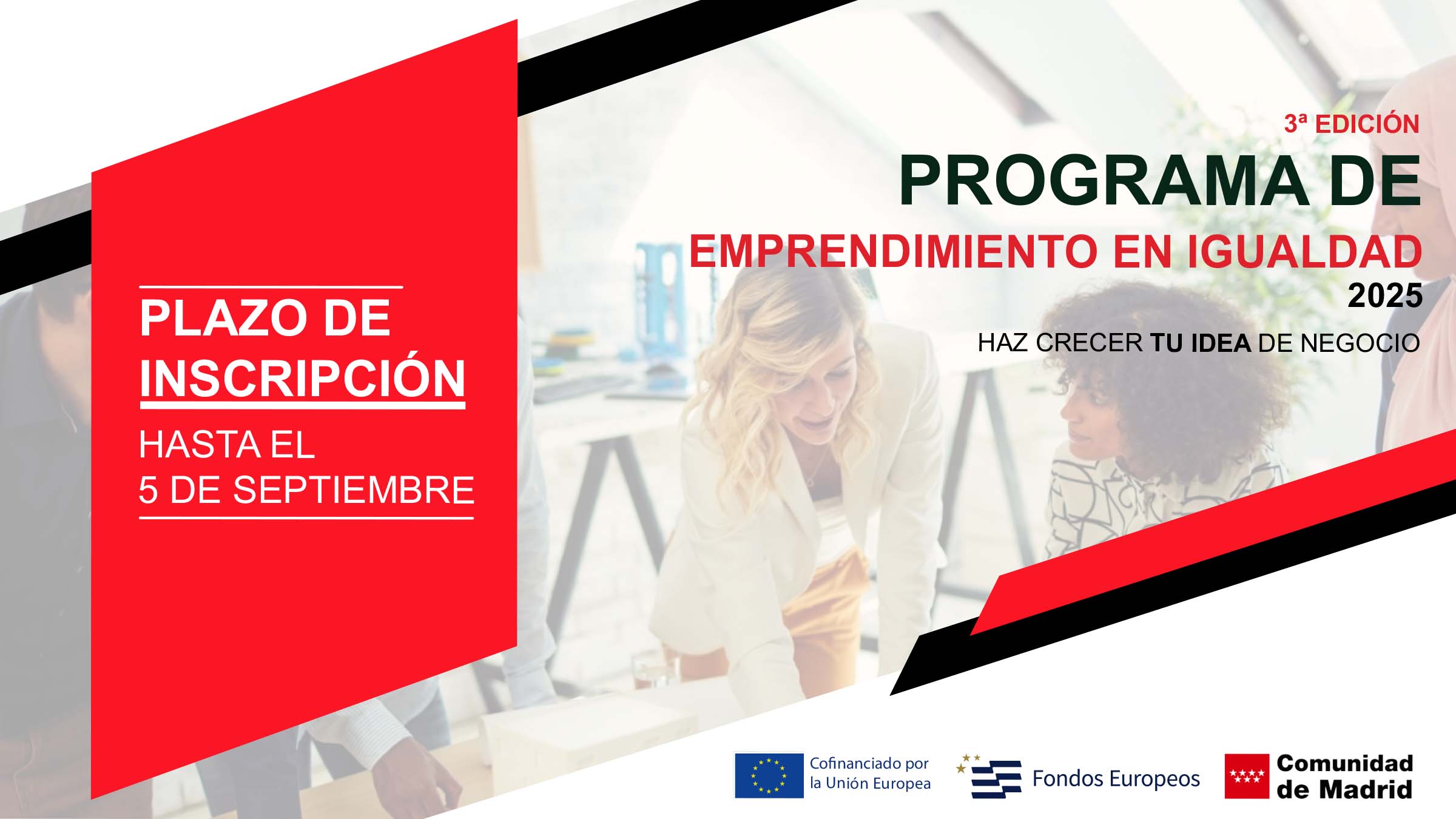 Por tercer año consecutivo, se lanza la convocatoria del Programa de “Emprendimiento en Igualdad 2025”, una iniciativa promovida por la Comunidad de Madrid con el propósito de apoyar proyectos empresariales y profesionales que fomenten la igualdad de oportunidades y acompañar a quienes emprenden en el desarrollo de sus ideas de negocio.